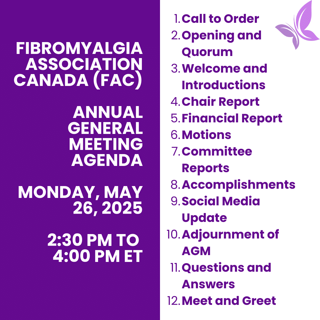 The AGM of Fibromyalgia Association Canada was held Monday, May 26th, with Trudy Flynn, the chair, presiding. The meeting began with a land acknowledgment and a report on the organization’s progress over the past year, highlighting efforts to raise awareness, support the community, and improve understanding of fibromyalgia. Trudy presented the financial report, and presented motions to accept the financial report and amended FAC bylaws. Both these motions were approved.