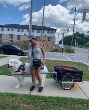Regular walks with LEE help me manage the pain throughout my body. The morning walks are extremely challenging. But the needs of the LEE motivate me to get this done. These walks to walk off Fibro pain. Sometimes, LEE carries a backpack and sometimes she pulls a trailer. I recognized that LEE was working for me, and I trained LEE to work as my Service Dog. Service Dogs Canada recognizes that I can train my own dog to meet the needs of my own disability. As per Service Dogs Canada, LEE is a stable, well-behaved, and unobtrusive dog to the public. I have control over LEE. She follows verbal and visual instructions. As a team, we do not pose a public hazard. In fact, we are welcome wherever we go. I taught LEE to pull grocery carts for me in the stores. I trained LEE using the knowledge and skills I developed over the course of my teaching career.