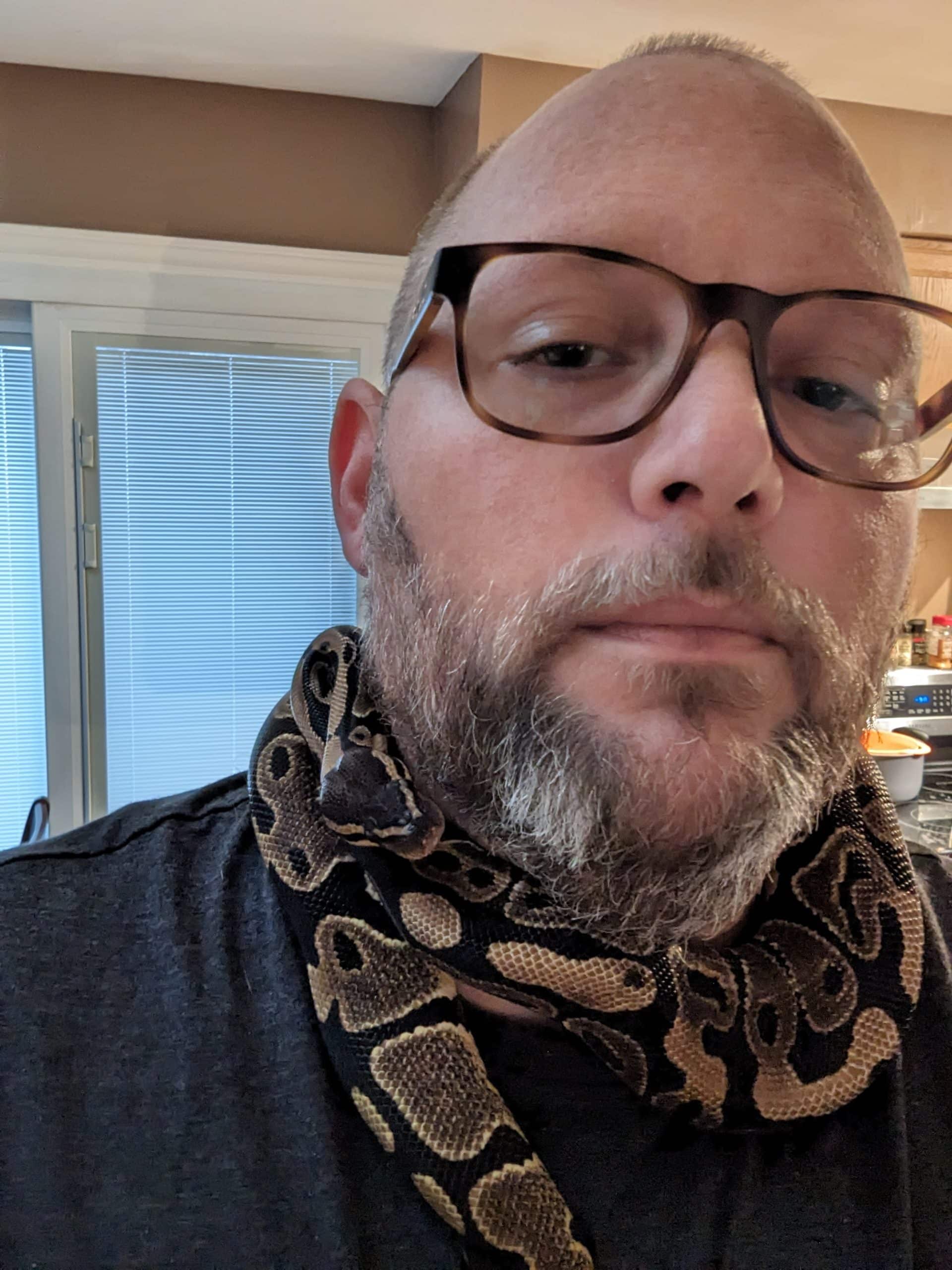 Through Facebook I found FAC, I read some stories, asked about FACes of Fibro, I sent in a pic of myself with one of my scaly friends named August. He is a fancy python, but what does a python have to do with Fibro? I am a proud father of 3, husband to an amazing supportive wife and we have a small “zoo” in my house consisting of a Beagle Terrier named Dax, 2 Bengal cats (Priya and Neo), they’re step siblings, same father different mothers, and last but not least 2 pythons, August and Lilith. August is the youngest, but I’ve had him longer, Lilith, Lillybug or just Lilly is an Orange Dream Enchi python, she is about 2 months older than August. I am going to talk mainly about my snakes and how they help me stay in the moment, help me stay mindful, provide me with an escape from daily stress and help with my pain management. A little about me, I have had chronic mechanical back pain since an injury in 2010, currently now in 2023, it’s been 5 years since being diagnosed with FMS as well as a few other things that the rigorous testing I had to go through to finally have an answer for why my body was revolting against me, Fibro is a disability of exclusion afterall, with no cure only management, it’s a life that I am sure no one would wish upon anyone else.